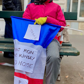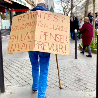 Les têtes d’Emmanuel Macron et d’Elisabeth Borne reposent sur le sol. Le scotch qui claque dans l’air : une jeune fille prend les têtes imprimées sur le carton à la main et les attache fermement aux bâtons. Son souffle irrégulier révèle une certaine excitation, commune à la foule de gens qui commence à se rassembler Place de l'Opéra. À son coté, Attac et Les Rosies brandissent leurs drapeaux : le symbole du pourcentage rouge ressort du fond blanc. « Aujourd’hui, on lutte contre ce projet de réforme injuste, injustifié et illégitime, » explique un porte-parole de l’association, qui milite depuis 1998 pour la justice fiscale, sociale et écologique. Ils invitent les manifestants à les suivre jusqu’à la place de la Bastille puis à les rejoindre à 19h en face de l’Assemblée Nationale. La tension est palpable entre les membres du groupe et ils n’hésitent pas à expliquer leur rage. « On a assisté ce matin à une forme de répression de la part du gouvernement. C’est absurde, mais on ne se taira pas ! » rugit Imen Habib faisant référence à la mise en garde à vue de 9 militants ce matin avant la manifestation. Il s’agit d’un petit rassemblement devant l’Assemblée Nationale, craie à la main, un chasuble géant bleu sur la statue portant le message « 64 ans, c’est non !». Des dégradations et pressions inqualifiables selon la présidente de l’Assemblée nationale, Yael Braun Pivet.