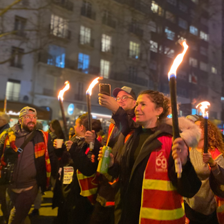 Les pancartes de couleurs éclatantes brûlent sous le soleil d’hiver. Quelqu’un danse aux vibrations des haut-parleurs, la musique assourdissante : rock, pop, reggae. Chaque chanson correspond à un groupe différent : de grands rassemblements de personnes commencent à se créer, une combinaison hétérogène. Rouge pour la CGT, rose fushia pour l’Union Syndicale Solidaires, vert pour Sud Rail.